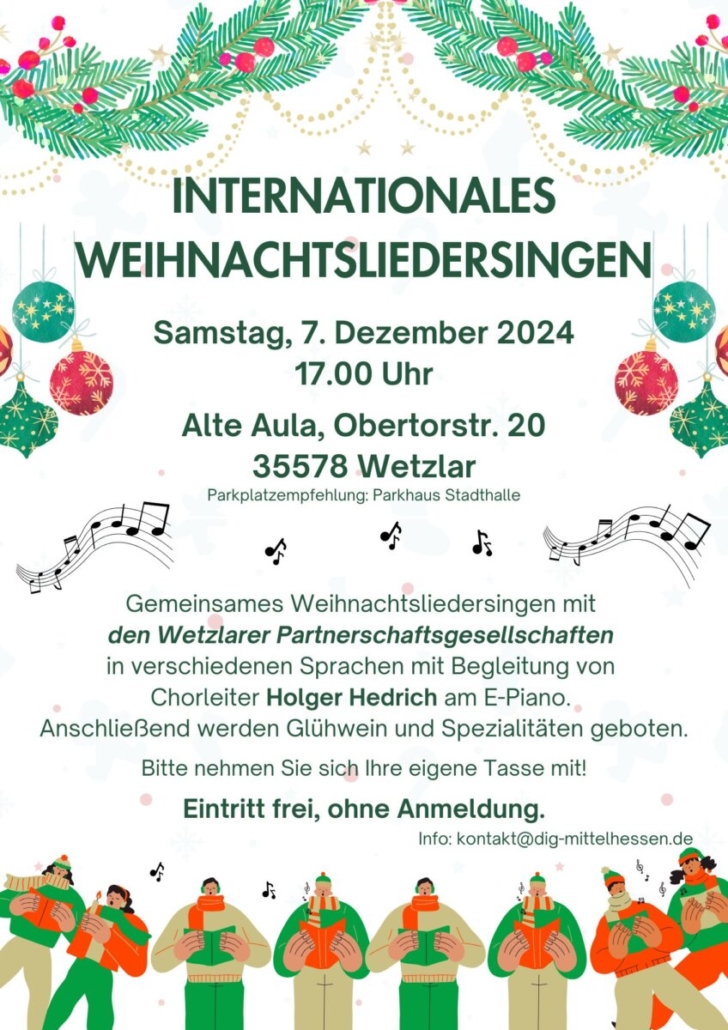 Die Wetzlarer Partnerschaftsgesellschaften freuen sich, Mitglieder, FreundInnen und Musikbegeisterte in jedem Alter zum traditionellen Internationalen Weihnachtsliedersingeneinzuladen.